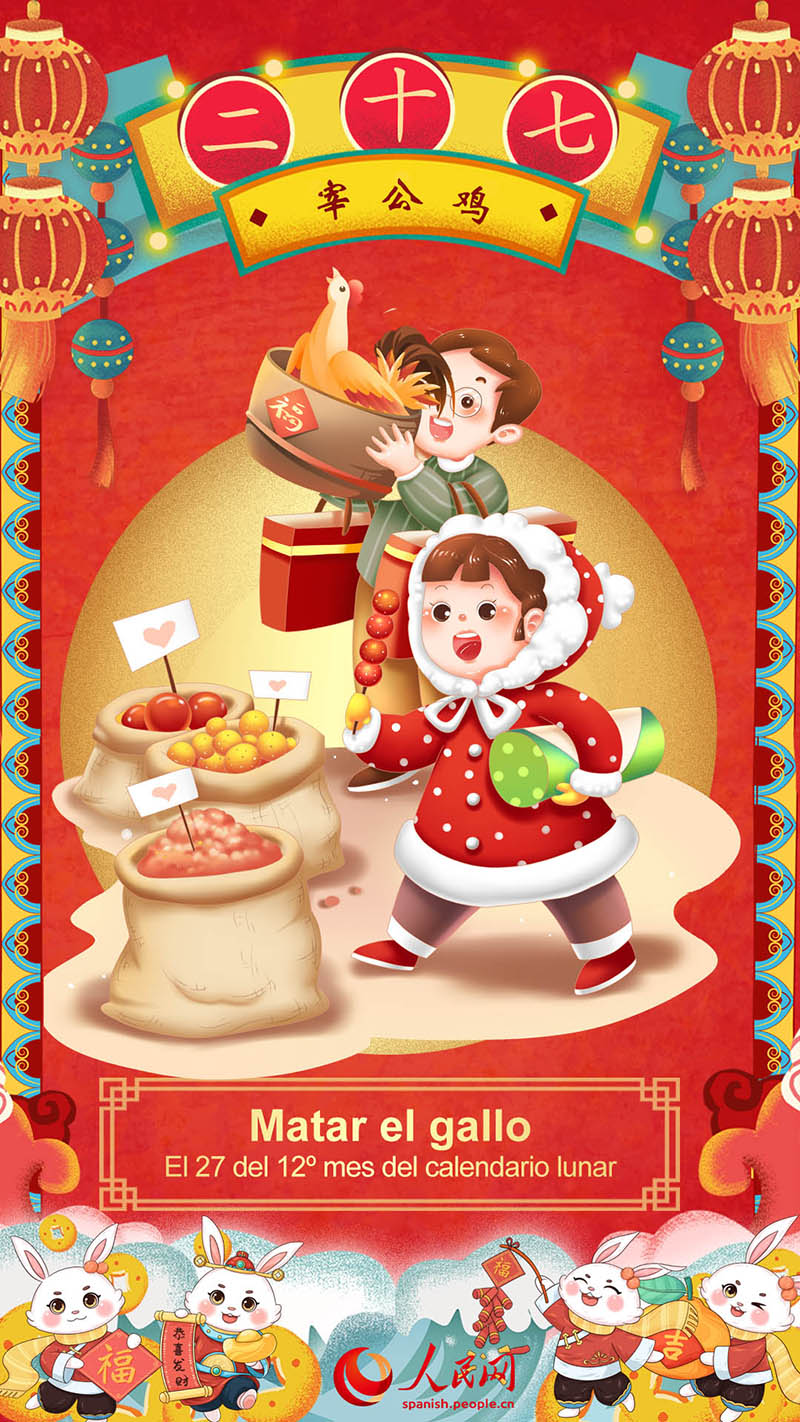 Según un dicho popular: "El día veintisiete, mata un gallo, bá?ate, aféitate y viste ropa nueva". En este día, es necesario sacrificar los gallos que se consumirán en A?o Nuevo Chino, ba?arse y cambiarse de ropa, dejar atrás la mala energía del a?o que acaba y prepararse para el próximo a?o.
