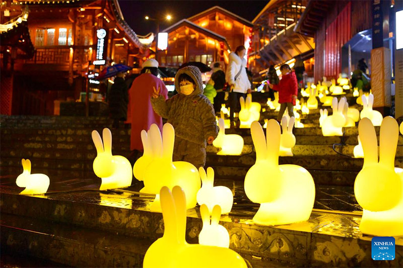 Un ni?o se hace una foto entre farolillos con forma de conejo en el condado Xuan'en, en la prefectura autónoma Tujia y Miao de Enshi de la provincia de Hubei, en el centro de China, el 15 de enero de 2023. A medida que se acerca el A?o Nuevo Lunar chino del conejo, artículos decorativos y artesanías con la imagen del conejo, uno de los 12 animales del zodíaco chino, están apareciendo por las calles, a?adiendo un ambiente festivo al evento. (Foto por Song Wen/Xinhua)