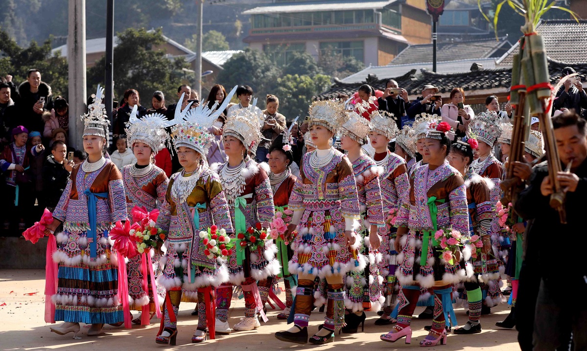 Los aldeanos Miao bailan con Luseng (flautas de junco) para celebrar el Festival Manghao el lunes en la aldea de Anning, condado Rong'an de la región autónoma de la etnia Zhuang de Guangxi. [Foto de Qin Qinghe/proporcionada a chinadaily.com.cn]