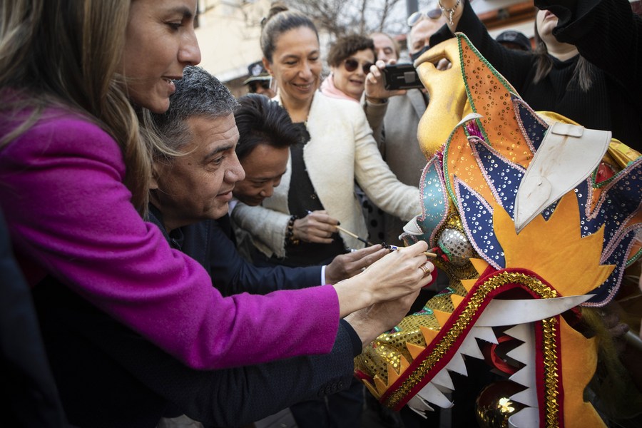 Jorge Macri (2-i), ministro de Gobierno de la ciudad de Buenos Aires, realiza un "clavado de pupilas" para despertar al dragón durante la celebración del Festival de Medio Oto?o, en el Barrio Chino de la ciudad de Buenos Aires, capital de Argentina, el 10 de septiembre de 2022. (Xinhua/Martín Zabala)