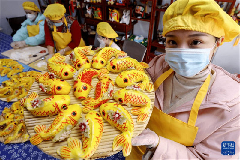 Residentes de la ciudad de Zaozhuang, provincia de Shandong, hacen pasteles tradicionales "pescado de masa", 13 de enero del 2023. [Foto: Xinhua]