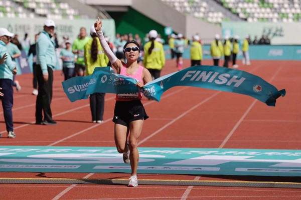 La campeona de maratón femenino Yang Hua cruza la línea de meta en el Estadio del Centro Deportivo Olímpico de Suzhou. (Foto cortesía del comité organizador del concurso)