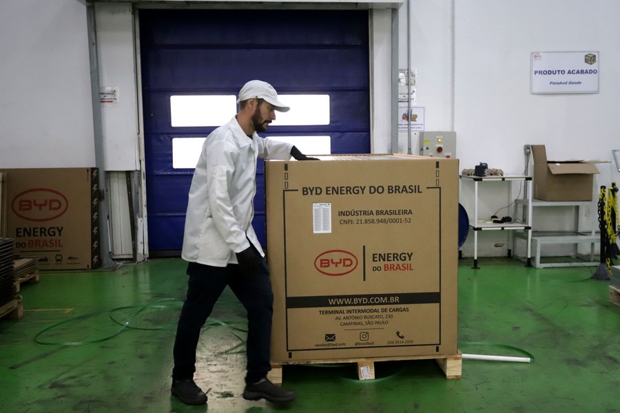 Imagen del 6 de septiembre de 2022 de un hombre trabajando en una planta de manufactura de paneles solares de la empresa china BYD, en Campinas, estado de Sao Paulo, Brasil. (Xinhua/Rahel Patrasso)