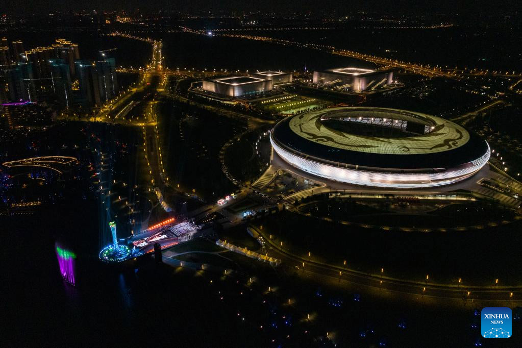 Vista aérea del 19 de abril de 2023 de las sedes en el espectáculo de luces para la cuenta regresiva de 100 días para los Juegos Mundiales Universitarios de FISU Chengdu 2021 en el Parque Deportivo del Lago Dong'an, en Chengdu, en la provincia de Sichuan, en el suroeste de China. (Xinhua/Shen Bohan)