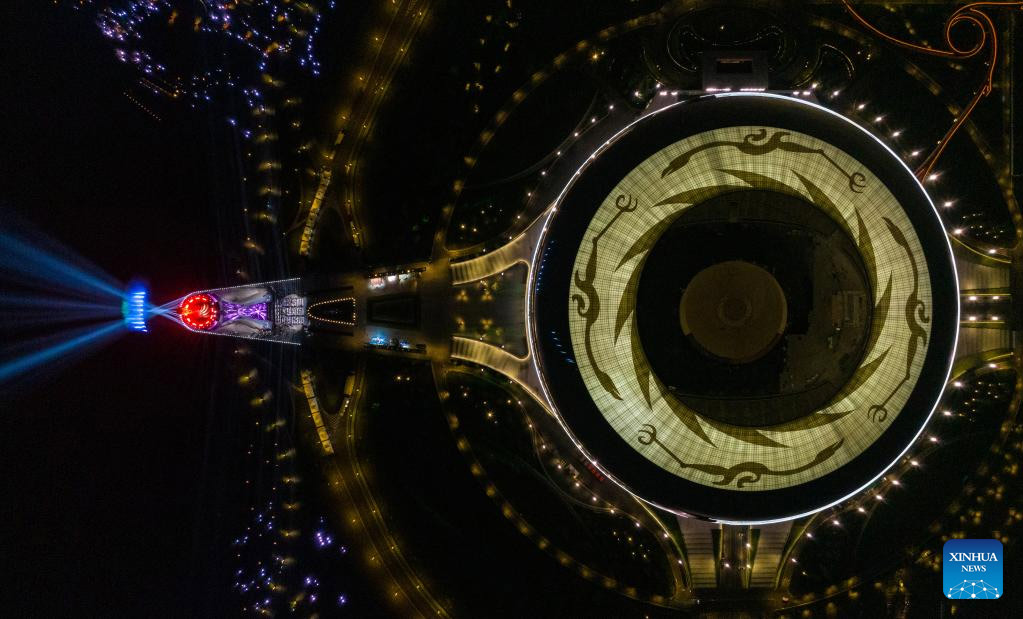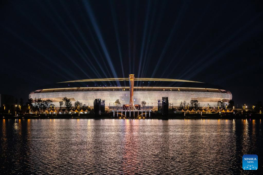 Vista aérea del 19 de abril de 2023 del estadio para la ceremonia de inauguración y el pebetero en el espectáculo de luces para la cuenta regresiva de 100 días para los Juegos Mundiales Universitarios de FISU Chengdu 2021 en el Parque Deportivo del Lago Dong'an, en Chengdu, en la provincia de Sichuan, en el suroeste de China. (Xinhua/Shen Bohan)