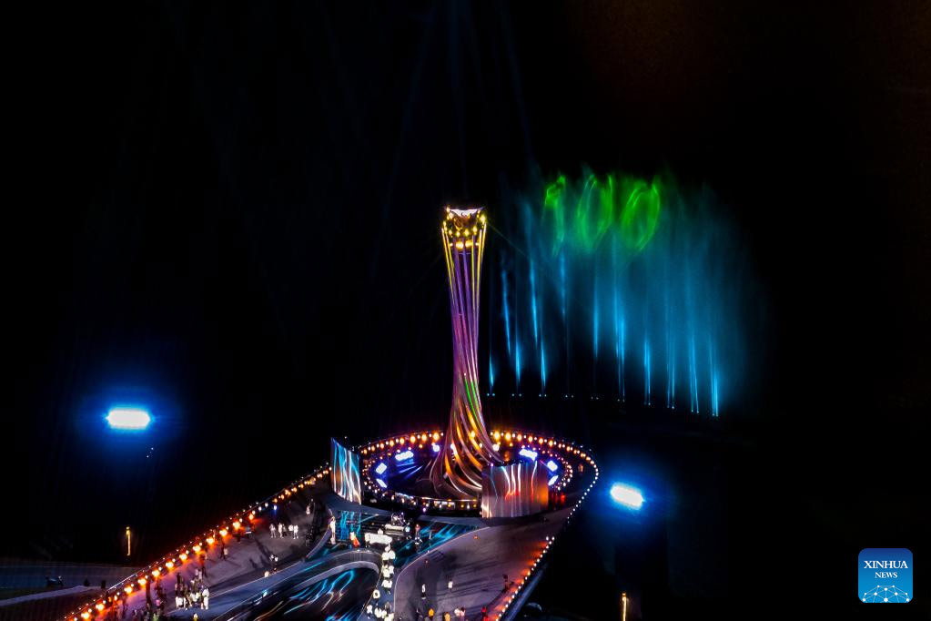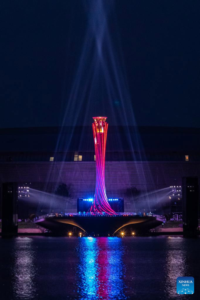 Vista aérea del 19 de abril de 2023 del pebetero en el espectáculo de luces para la cuenta regresiva de 100 días para los Juegos Mundiales Universitarios de FISU Chengdu 2021 en el Parque Deportivo del Lago Dong'an, en Chengdu, en la provincia de Sichuan, en el suroeste de China. (Xinhua/Shen Bohan)