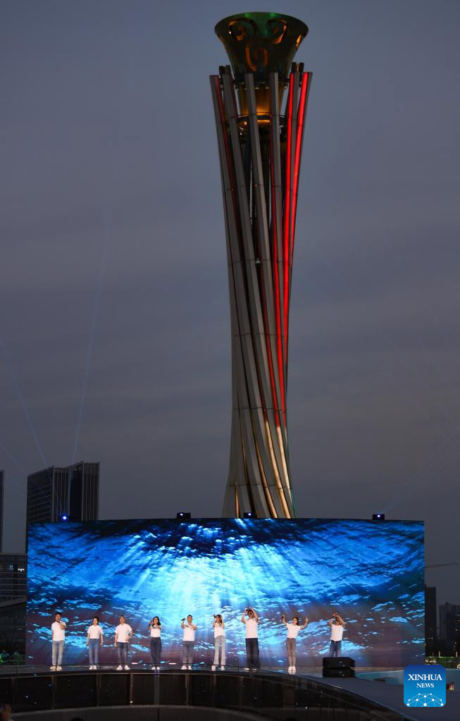 Estudiantes del Conservatorio de Música de Sichuan entonan una canción en el evento de la cuenta regresiva de 100 días para los Juegos Mundiales Universitarios de FISU Chengdu 2021 en el Parque Deportivo del Lago Dong'an, en Chengdu, en la provincia de Sichuan, en el suroeste de China, el 19 de abril de 2023. (Xinhua/Wang Xi)