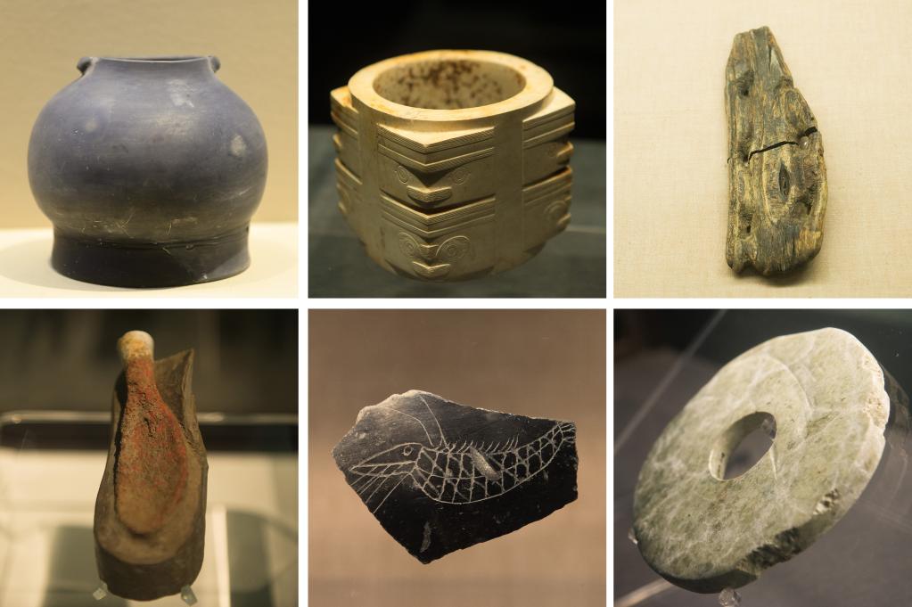 Imagen combianda de artefactos excavados del sitio de reliquias de Liangzhu, en Hangzhou, capital de la provincia de Zhejiang, en el este de China. Las ruinas arqueológicas de la ciudad de Liangzhu en China fueron puestas el sábado en la Lista de Patrimonio Mundial de la UNESCO como un sitio cultural con lo que el número de sus lugares de patrimonio en dicho catálogo llega a 55.(Xinhua/Weng Xinyang)