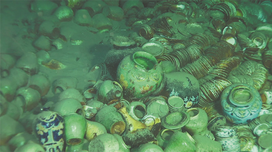 Foto publicada este domingo por la Administración Nacional de Patrimonio Cultural que muestra reliquias de porcelana esparcidas alrededor de uno de los naufragios del Mar Meridional de China. [Foto: China Daily]