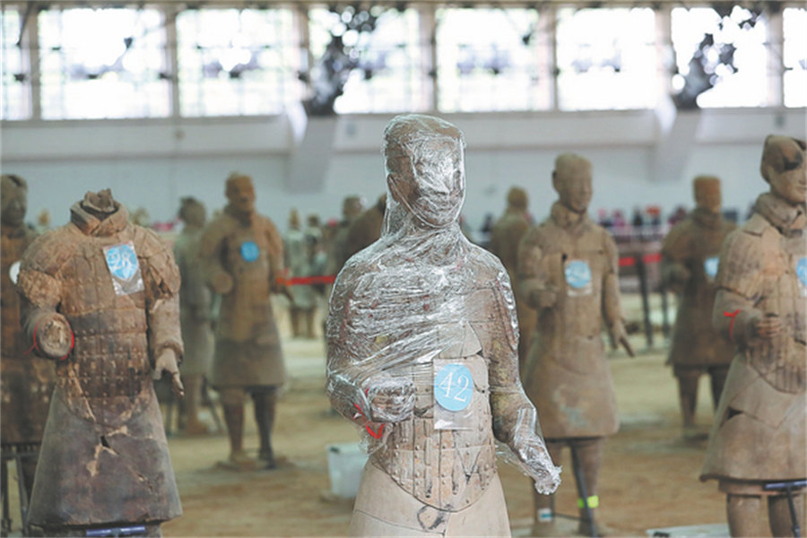 Láminas de plástico se aplican a la tierra apisonada de la muralla de la ciudad antigua de Pingyao, en Jinzhong, provincia de Shanxi, 20 de octubre del 2021. (Foto: Zou Hong/ China Daily)