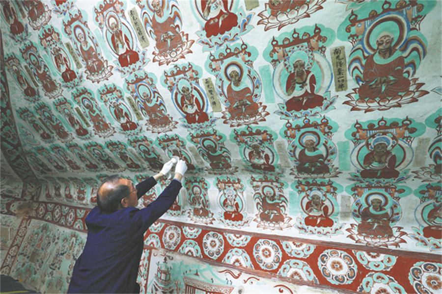 Fan Zaixuan, restaurador de la Academia Dunhuang, trabaja en un mural da?ado en las cuevas de Mogao, Dunhuang, provincia de Gansu, 16 de mayo del 2023. (Foto: Zou Hong/ China Daily)