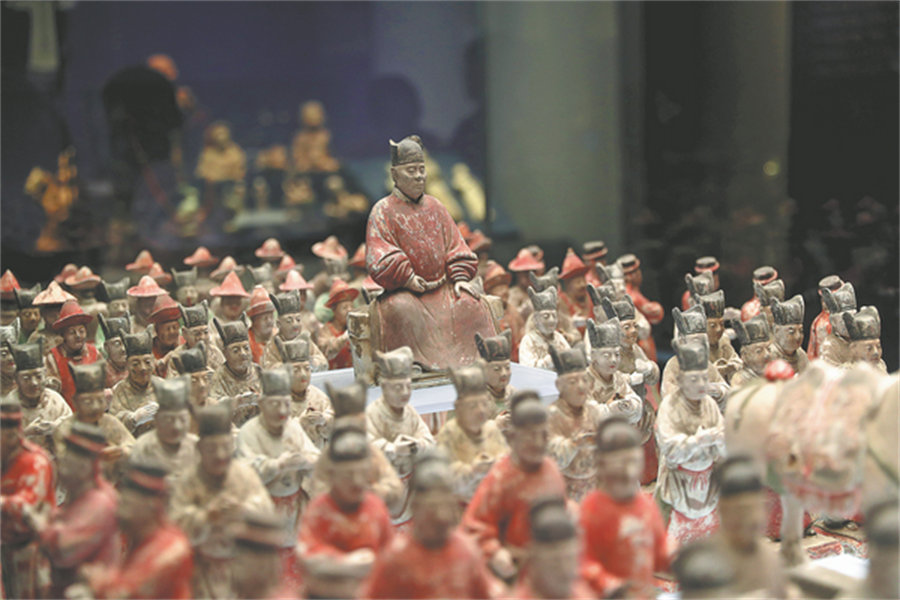 Una colección de figuras de cerámica pintadas restauradas de la dinastía Ming (1368-1644) en exhibición en el Museo de Historia de Shaanxi en Xi'an, el 2 de abril. (Foto: Zou Hong/ China Daily)
