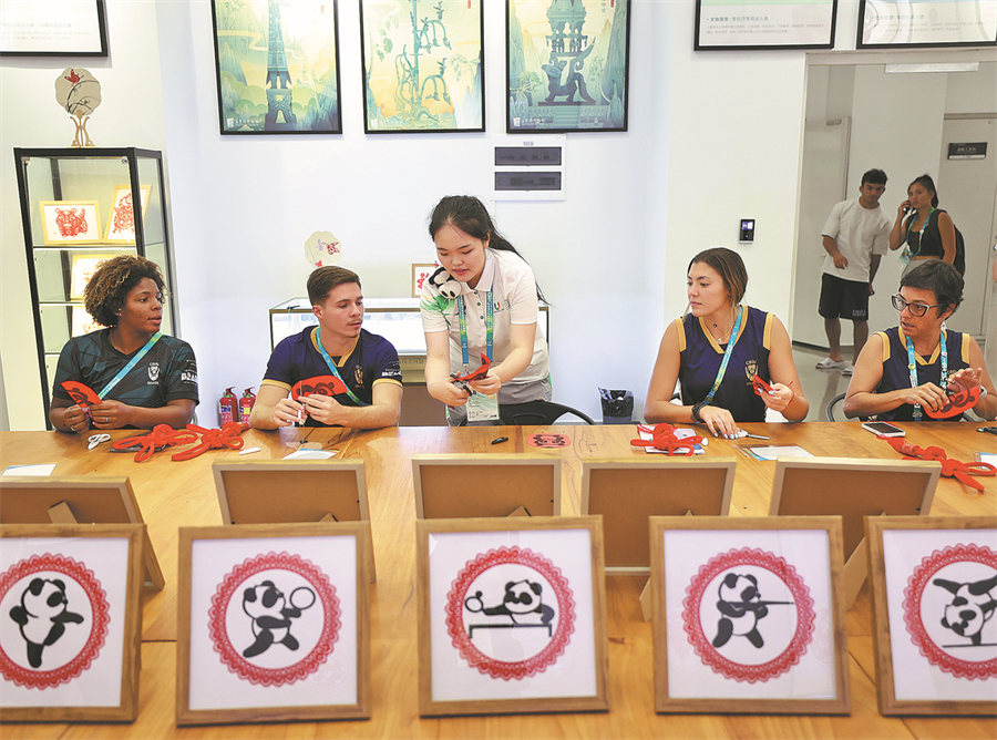 En la villa, una voluntaria ayuda a los atletas a experimentar el arte chino de recortar papel, 31 de julio del 2023. (Foto: Wei Xiaohao/ China Daily)