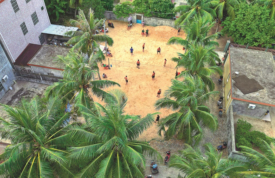 Una foto aérea muestra a los aldeanos jugando un partido de voleibol de playa en la aldea de Lantian, Wenchang, Hainan, 20 de julio del 2023. (Foto: Zhu Xingxin/ China Daily)