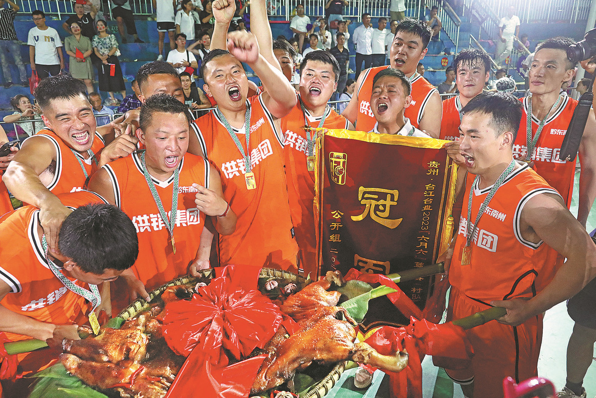 Miembros del equipo que ganó el campeonato de la “Asociación de Baloncesto de Aldeas” posan con su premio: un lechón asado, en la aldea Taipan de Guizhou, 31 de julio del 2023. (Foto: Zhu Xingxin/ China Daily)
