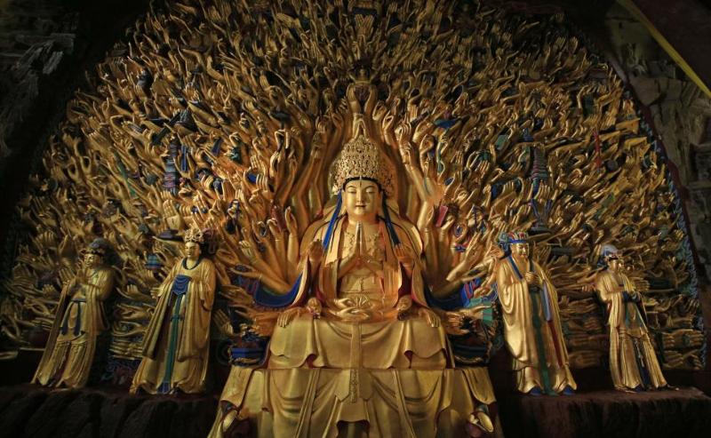 Estatua del Bodhisattva Avalokitesvara de mil brazos, una parte integral de las tallas rupestres de Dazu en el Monte Baoding de Dazu, en Chongqing. (Foto: cortesía de la Academia de Tallas de Roca de Dazu)