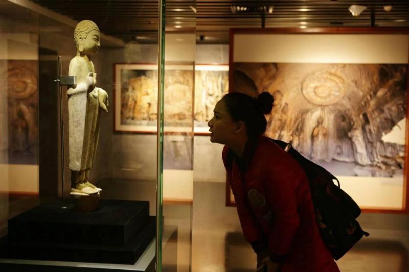 Una visitante ve una escultura budista en el Museo de Tallas de Roca de Dazu en el distrito de Dazu, en el municipio de Chongqing, suroeste de China. (Foto cortesía de la Academia de Tallas de Roca de Dazu)