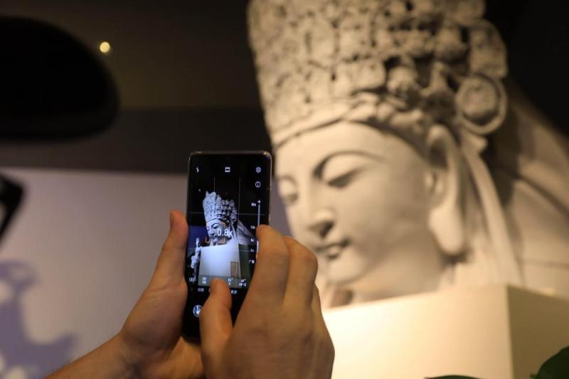 Un visitante toma una foto de una estatua impresa en 3D del Bodhisattva Avalokitesvara de las tallas rupestres de Dazu en el distrito de Dazu, en el municipio de Chongqing, suroeste de China. (Foto/Qu Bo)