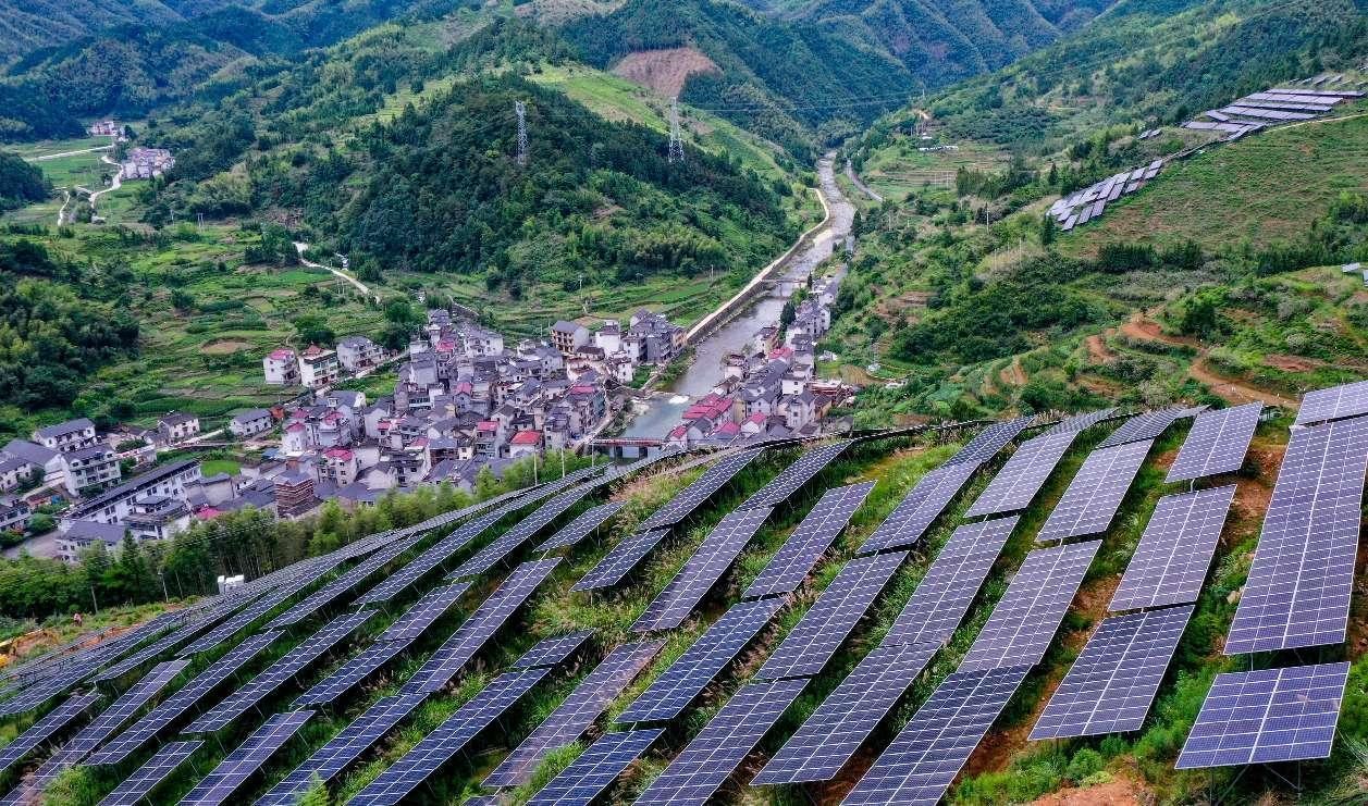Proyecto centralizado de generación de energía fotovoltaica complementaria a la agricultura en la aldea Zhangcun de Hangzhou, capital de la provincia de Zhejiang. (Foto: Yang Bo/ Diario del Pueblo Digital)