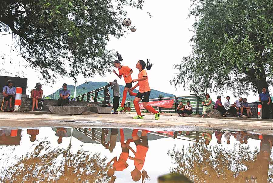 Dos miembros del equipo juegan fútbol en la plaza pública de la aldea de Xixiaoshui. (Foto: Zhao Dongshan/ China Daily)