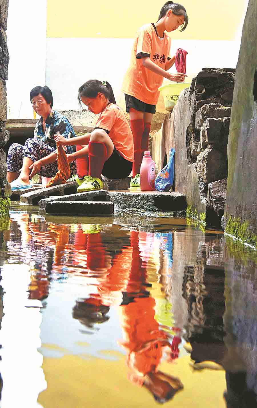 Después del entrenamiento, dos miembros del equipo femenino de fútbol lavan ropa con sus familiares junto a un río de la aldea Xixiaoshui en Yuezhuang. (Foto: Zhao Dongshan/ China Daily)
