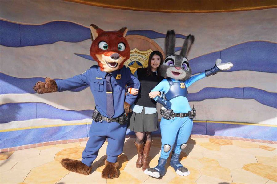 Una invitada posa con Judy (derecha) y Nick en la zona de Zootopia en Shanghai Disney Resort, este de China. [Foto de Gao Erqiang/China Daily]
