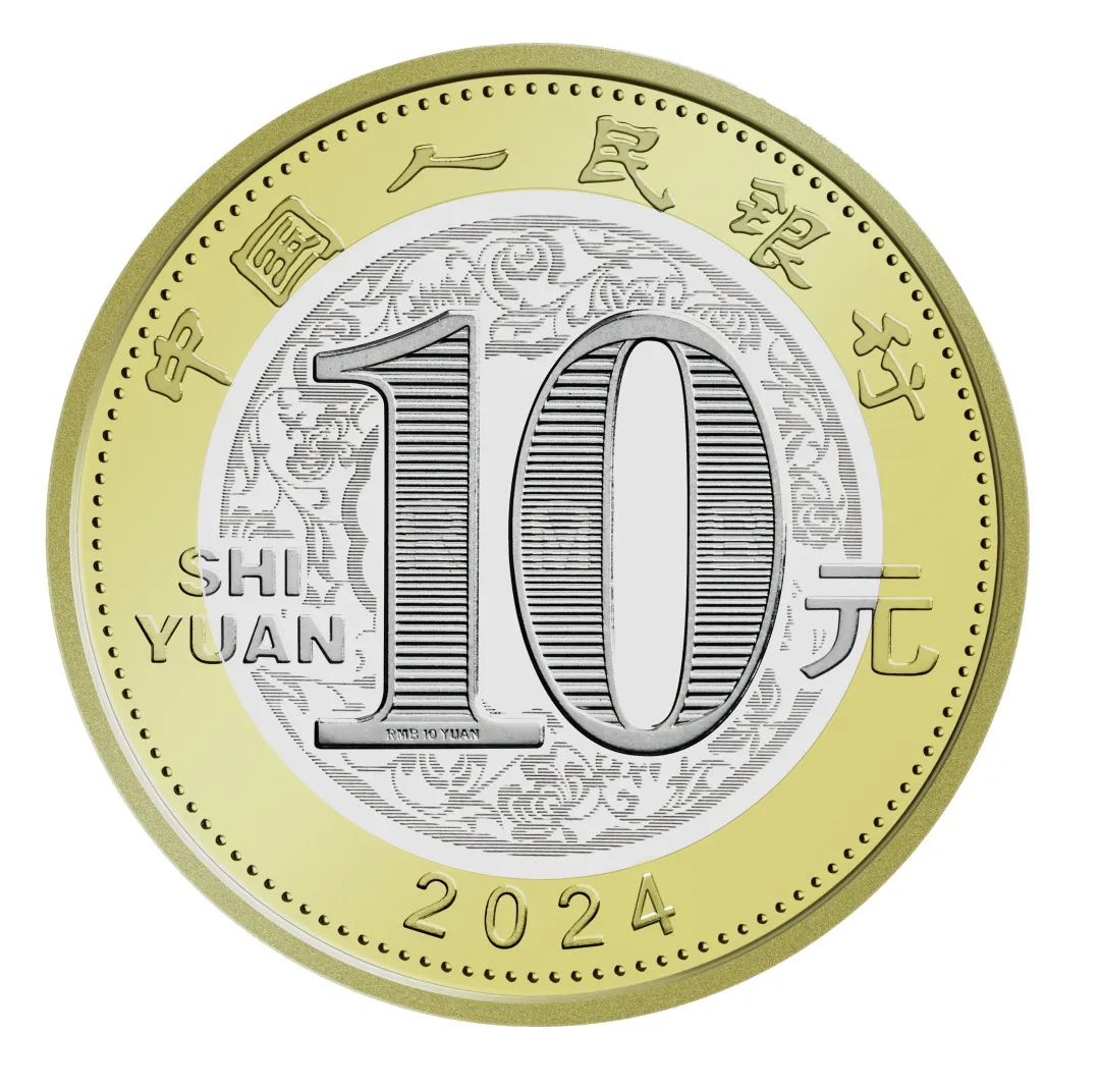 El anverso de la moneda de aleación de cobre de dos colores presenta caracteres chinos que se traducen como "Banco Popular de China", "10 yuanes", "SHIYUAN" en pinyin, que significa 10 yuanes, y "2024", el a?o de emisión con un patrón decorativo en el fondo.