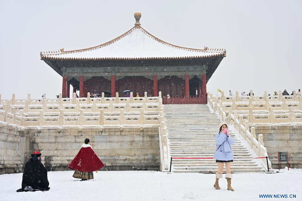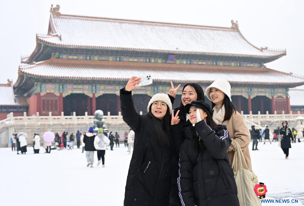 Turistas visitan el Museo del Palacio en la nieve, en Beijing, capital de China, el 13 de diciembre de 2023. La autoridad meteorológica de China renovó el miércoles la alerta amarilla por ventiscas, pronosticando intensas nevadas en el norte del país. (Xinhua/Li Xin)