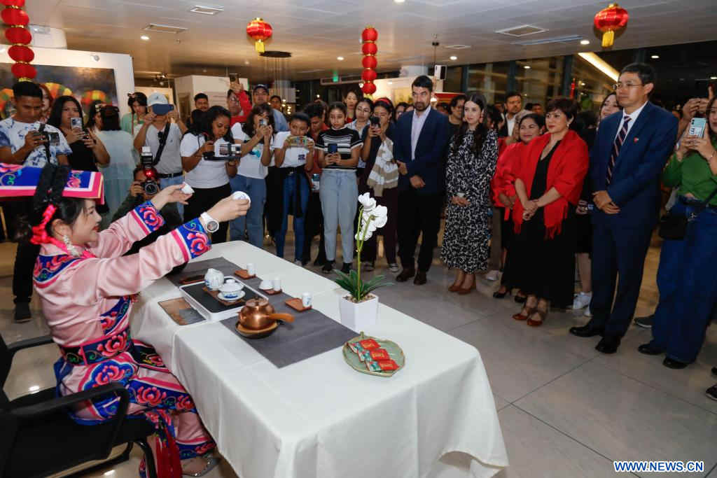| Imagen del 14 de febrero de 2024 de Zhang Yanhui (2-d), embajador de China en El Salvador, observando una ceremonia de té impartida por Zhao Rong (i), maestra china del Instituto Confucio de El Salvador, junto a autoridades salvadore?as durante la celebración del A?o Nuevo Chino en la Biblioteca Nacional de El Salvador (Binaes), en el Centro Histórico, en el departamento de San Salvador, El Salvador. Con la presentación de variadas manifestaciones artísticas típicas de China y un vistoso espectáculo de fuegos artificiales y drones que iluminaron el cielo nocturno de la zona central e histórica de la capital salvadore?a, centenares de personas celebraron el miércoles el A?o Nuevo Chino en la Binaes. (Xinhua/Alexander Pe?a) |