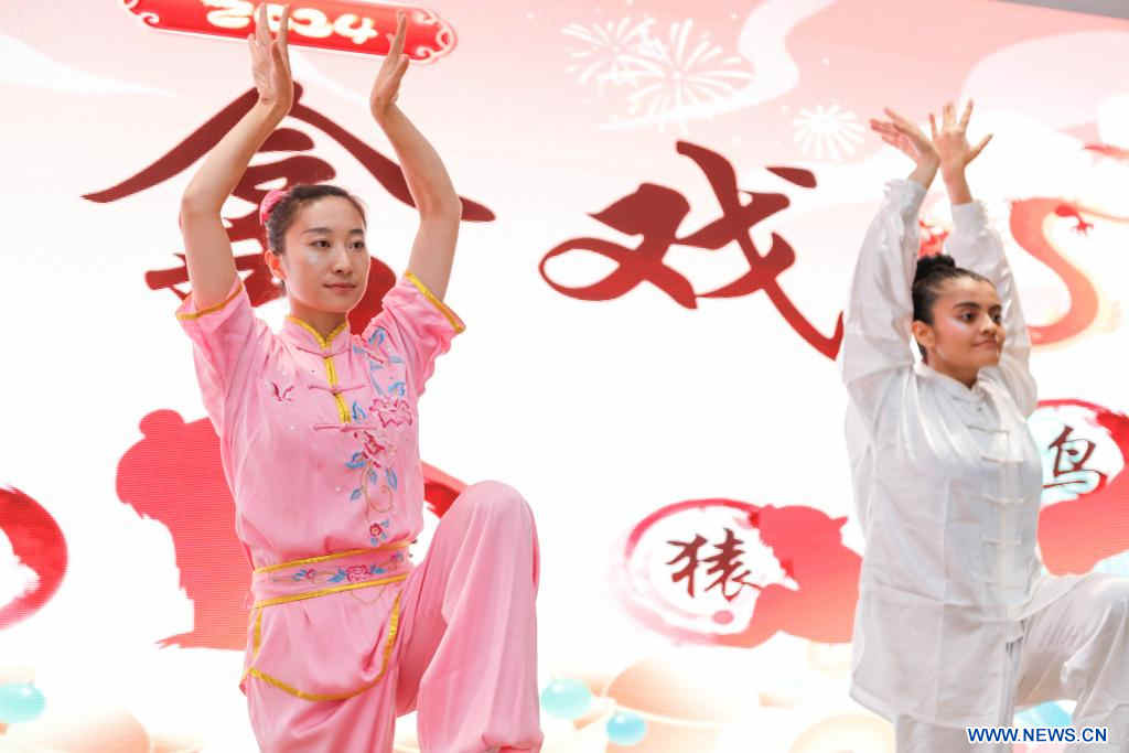 | Imagen del 14 de febrero de 2024 de Ma Ting (i), maestra del Instituto Confucio de El Salvador, participando en una presentación de artes marciales junto a una alumna salvadore?a durante la celebración del A?o Nuevo Chino en la Biblioteca Nacional de El Salvador (Binaes), en el Centro Histórico, en el departamento de San Salvador, El Salvador. Con la presentación de variadas manifestaciones artísticas típicas de China y un vistoso espectáculo de fuegos artificiales y drones que iluminaron el cielo nocturno de la zona central e histórica de la capital salvadore?a, centenares de personas celebraron el miércoles el A?o Nuevo Chino en la Binaes. (Xinhua/Alexander Pe?a) |