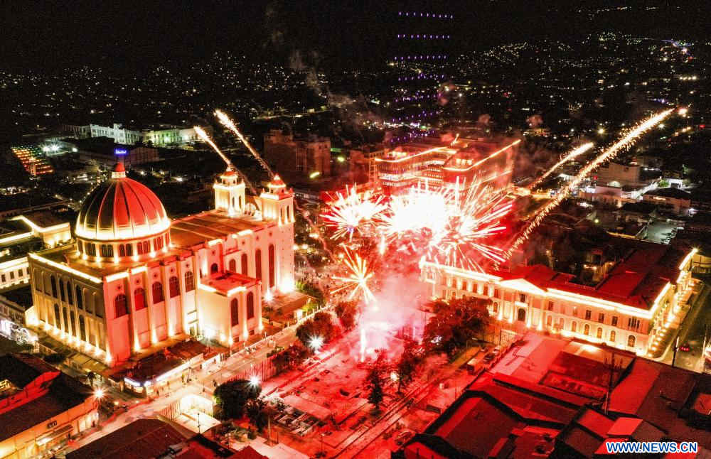 | Imagen tomada con un dron el 14 de febrero de 2024 de un espectáculo de fuegos artificiales durante la celebración del A?o Nuevo Chino en la Biblioteca Nacional de El Salvador (Binaes), en el Centro Histórico, en el departamento de San Salvador, El Salvador. Con la presentación de variadas manifestaciones artísticas típicas de China y un vistoso espectáculo de fuegos artificiales y drones que iluminaron el cielo nocturno de la zona central e histórica de la capital salvadore?a, centenares de personas celebraron el miércoles el A?o Nuevo Chino en la Binaes. (Xinhua/Alexander Pe?a) |