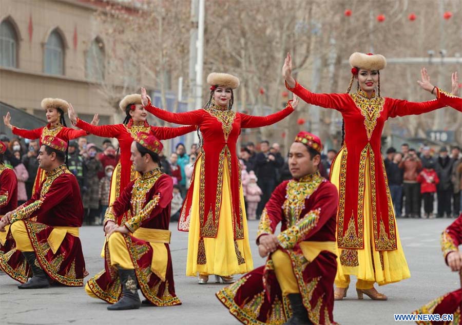 Personas realizan una presentación de danza durante un evento para celebrar el Festival de las Linternas, en el distrito de Yecheng, en la región autónoma uygur de Xinjiang, en el noroeste de China, el 24 de febrero de 2024. Personas de todo el país celebran el Festival de las Linternas, que este a?o cayó el 24 de febrero, en medio de un ambiente festivo y bullicioso. (Xinhua/Hu Huhu)