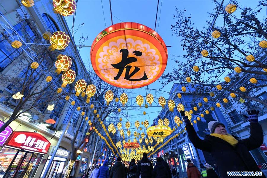 Turistas observan linternas en la calle Central, en Harbin, en la provincia de Heilongjiang, en el noreste de China, el 24 de febrero de 2024. Personas de todo el país celebran el Festival de las Linternas, que este a?o cayó el 24 de febrero, en medio de un ambiente festivo y bullicioso. (Xinhua/Wang Jianwei)