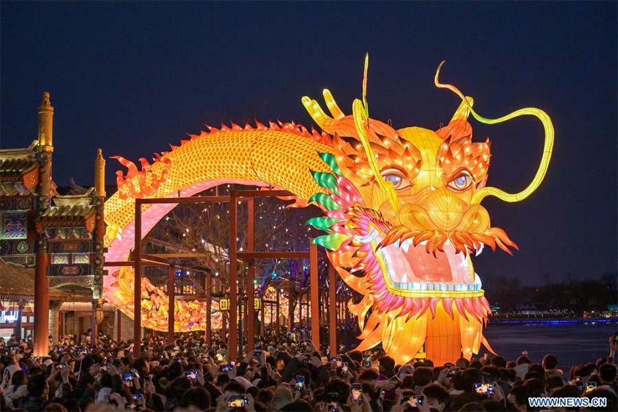 Personas observan una linterna de dragón, en el distrito de Xicheng, en Beijing, capital de China, el 24 de febrero de 2024. Personas de todo el país celebran el Festival de las Linternas, que este a?o cayó el 24 de febrero, en medio de un ambiente festivo y bullicioso. (Xinhua/Li Xin)