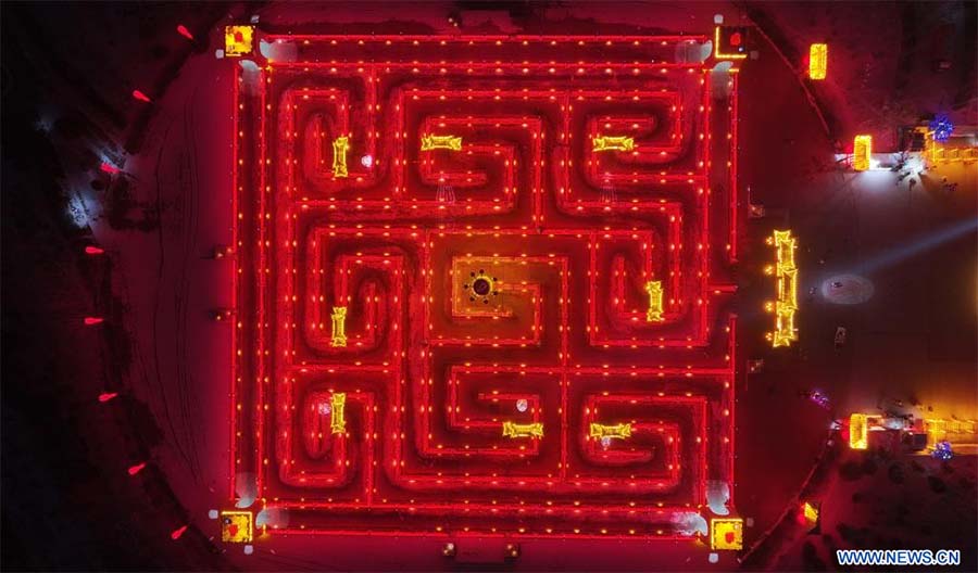 Vista aérea tomada con un dron el 23 de febrero de 2024 de linternas en celebración del Festival de las Linternas, en el distrito de Yanchi, en la región autónoma hui de Ningxia, en el noroeste de China. Personas de todo el país celebran el Festival de las Linternas, que este a?o cayó el 24 de febrero, en medio de un ambiente festivo y bullicioso. (Xinhua/Wang Peng)