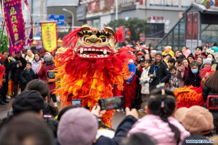 Personas observan la danza del león, en el distrito de Xunxian, en la provincia de Henan, en el centro de China, el 24 de febrero de 2024. Personas de todo el país celebran el Festival de las Linternas, que este a?o cayó el 24 de febrero, en medio de un ambiente festivo y bullicioso. (Xinhua/Zhu Xiang)