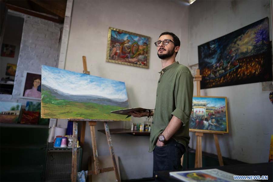 Imagen del 5 de abril de 2024 del artista argentino, Gastón Rovella Spatafore, reaccionando en su taller, en la ciudad de Buenos Aires, Argentina. Una afición por coleccionar piedras semipreciosas desde la ni?ez se convertiría en el puente que llevaría al pintor argentino, Gastón Rovella Spatafore, a sumergirse en el fascinante mundo de la pintura china, distinguiéndose en la actualidad por ser uno de los pocos artistas del país volcados a retratar la China moderna. (Xinhua/Martín Zabala)