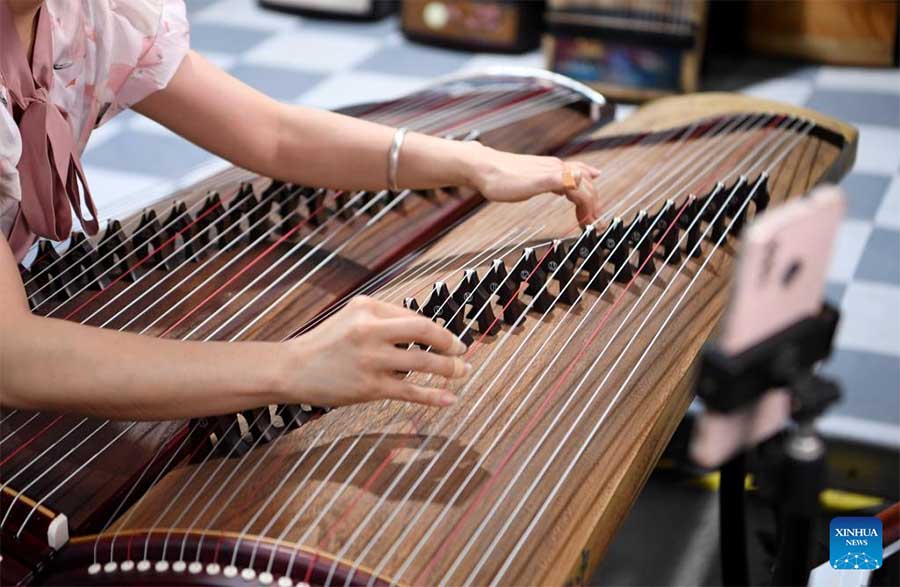Imagen del 13 de mayo de 2024 de una trabajadora vendiendo guzheng, también conocido como cítara china, a través de transmisión en vivo, en el distrito de Lankao de la ciudad de Kaifeng, en la provincia de Henan, en el centro de China. En los últimos a?os, el distrito de Lankao ha desarrollado vigorosamente la industria de instrumentos musicales tradicionales en un esfuerzo por utilizar plenamente los árboles de paulownia, que abundan en el distrito. El distrito de Lankao alberga ahora más de 200 empresas de instrumentos musicales tradicionales, que proveen guzheng, guqin, pipa y otros instrumentos musicales tradicionales chinos. (Xinhua/Shao Zedong)