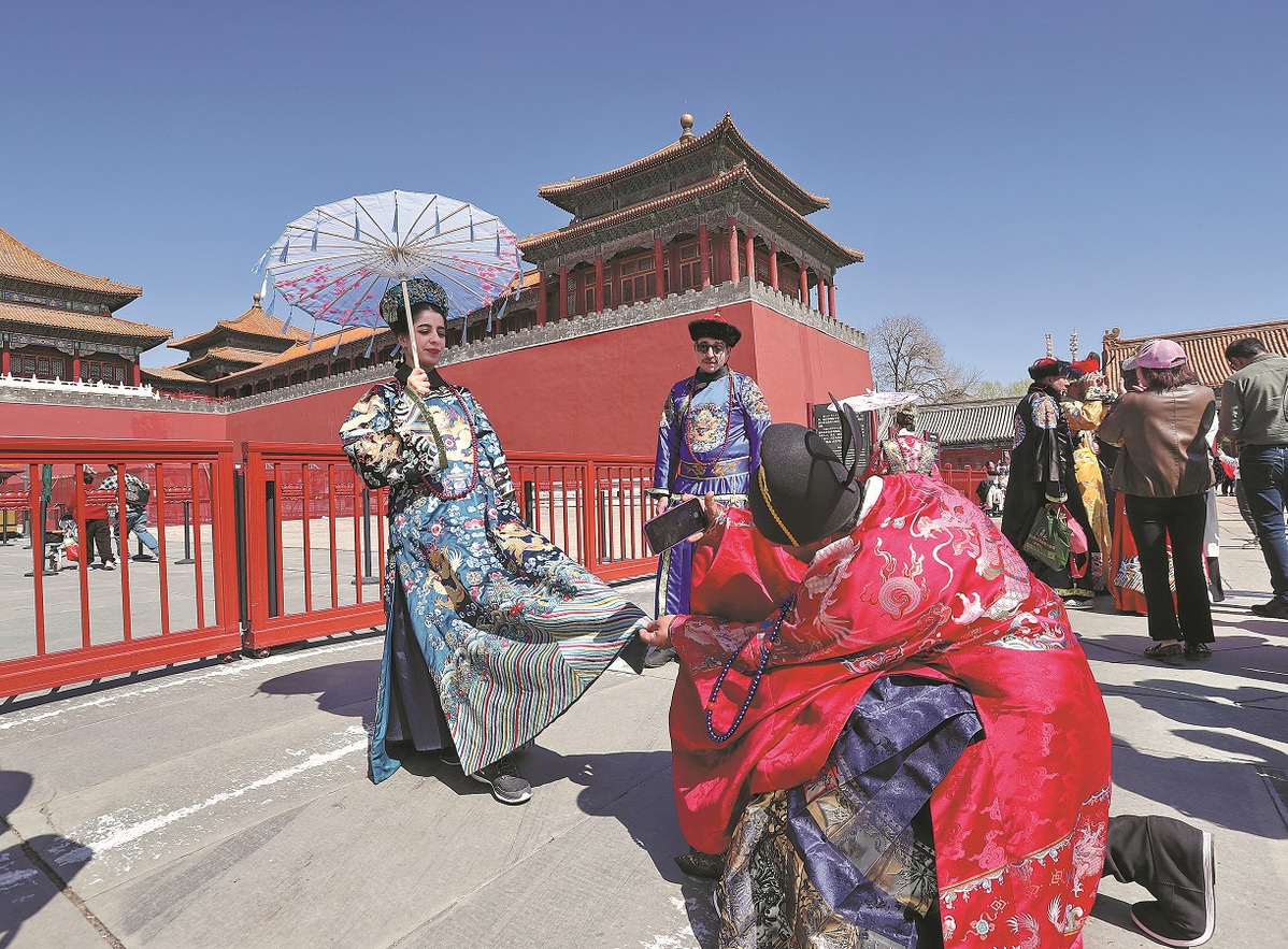Turistas extranjeros vestidos con hanfu, la vestimenta tradicional del grupo étnico Han, visitan el Museo del Palacio en Beijing en marzo. [Foto proporcionada a CHINA DAILY]