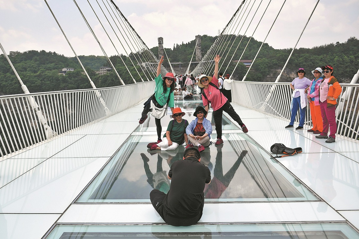 Turistas de Corea del Sur posan para una fotografía en un puente de cristal en el área escénica de Zhangjiajie en la provincia de Hunan en mayo. CHEN ZHENHAI/XINHUA