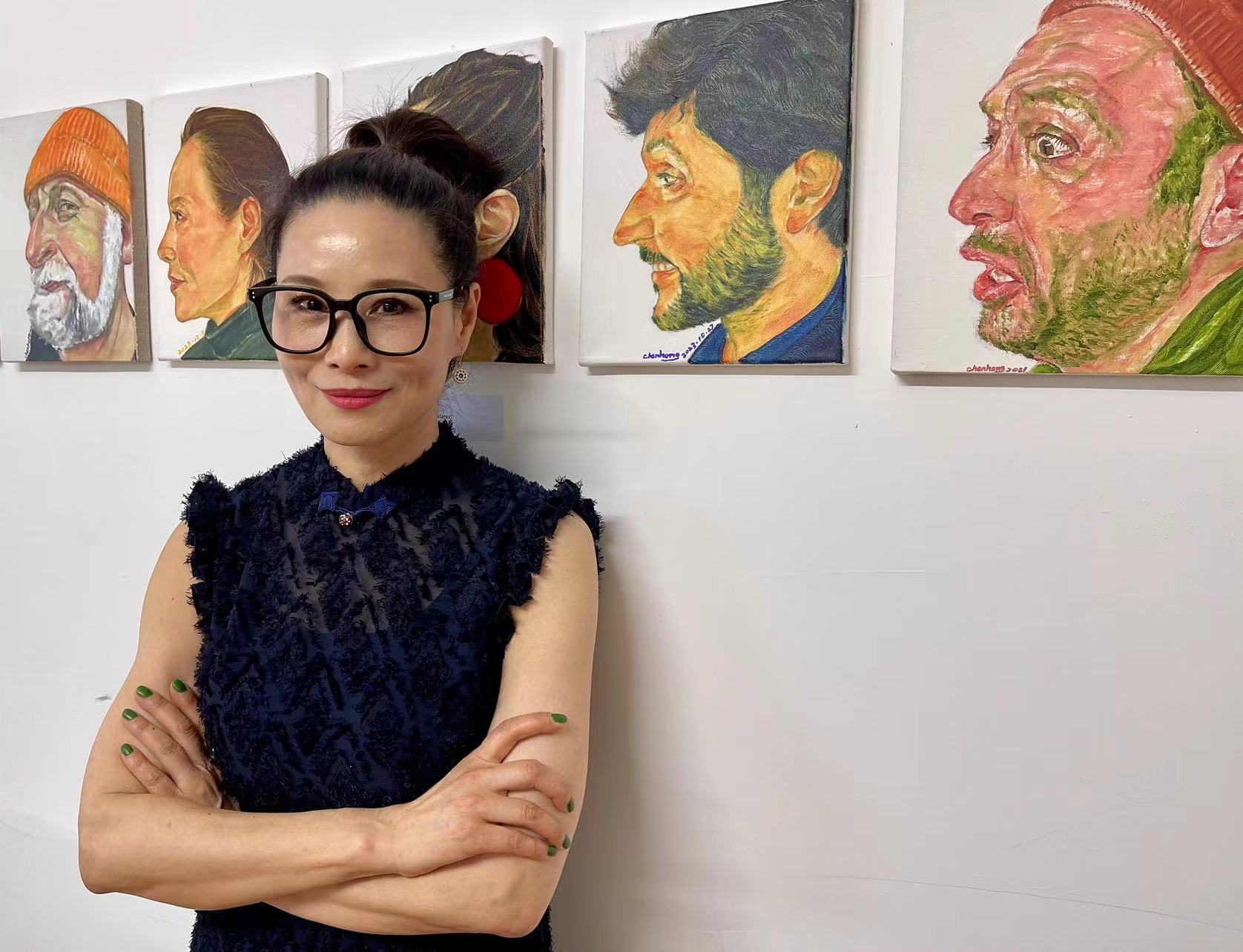 La artista china Cheng Hong, fotografiada ante su obra en la Galería de Arte Latinoamericano y Residencia de Artistas de Mil Gotas, Beijing, 15 de junio del 2024. (Foto: YAC)