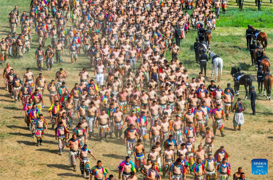 Vista aérea tomada con un dron el 14 de julio de 2024 de luchadores de estilo tradicional mongol durante la ceremonia de apertura del 34 festival Naadam, en la Liga de Xilingol, en la región autónoma de Mongolia Interior, en el norte de China. El festival Naadam comenzó aquí el domingo. Naadam, que suele celebrarse a mediados de verano y a veces en invierno en las zonas de pastoreo de Mongolia Interior, significa "juegos" en mongol. Suele incluir lucha, tiro con arco y carreras de caballos, también conocidos como los "Tres Juegos de los Hombres". (Xinhua/Lian Zhen)