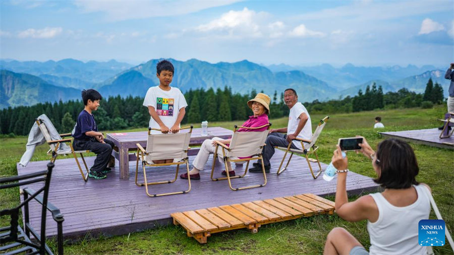 Imagen del 18 de julio de 2024 de turistas divirtiéndose en un parque forestal cerca del poblado cultural étnico yi de Haiping, en Liupanshui, en la provincia de Guizhou, en el suroeste de China. Desde que comenzaron las vacaciones de verano, el poblado cultural étnico yi de Haiping ha sido testigo de un auge de turismo. Con una altitud media cercana a los 1.900 metros, el poblado goza de buenas condiciones medioambientales y temperatura templada. En los últimos a?os, las autoridades locales han aprovechado el entorno ecológico y los recursos de monta?a para promocionar su turismo de verano. (Xinhua/Tao Liang)