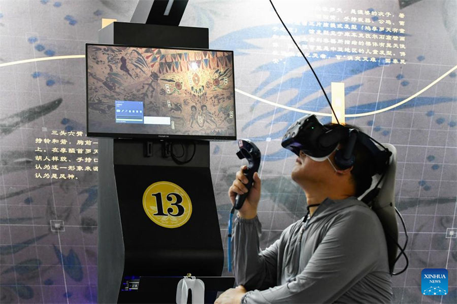 Una visitante utiliza un equipo de realidad virtual (RV) para visitar las Grutas de Mogao, en Dunhuang, en la provincia de Gansu, en el noroeste de China, el 22 de julio de 2024. Una exposición digital que utiliza tecnologías como modelado 3D y dispositivos de realidad virtual es llevada a cabo para ayudar a los visitantes a tener una impresión inmersiva de la cultura de Dunhuang. Uno de los pasos clave de la antigua Ruta de la Seda, Dunhuang, alberga las Grutas de Mogao, un sitio declarado Patrimonio de la Humanidad por la UNESCO que cuenta con una vasta colección de obras de arte budistas. (Xinhua/Lang Bingbing)