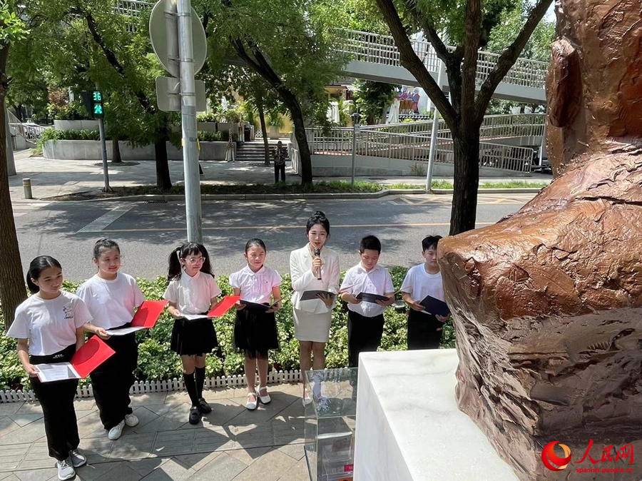 | Durante la inauguración del busto del destacado poeta chileno Pablo de Rokha, un grupo de ni?os, llegados de la provincia de Fujian, recitaron a coro el poema “Gentes y Calles de Pekín”, Beijing, 31 de julio del 2024. (Foto: YAC) |