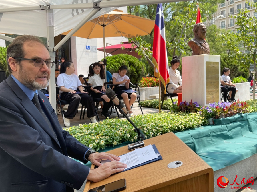 Durante el sencillo acto, Mauricio Hurtado, embajador de Chile en China, recordó que “l(fā)a decisión de erigir un busto en honor al premio nacional de literatura Pablo de Rokha no solo celebra su legado literario, sino que también destaca su papel crucial en el establecimiento de vínculos culturales con la República Popular China”.