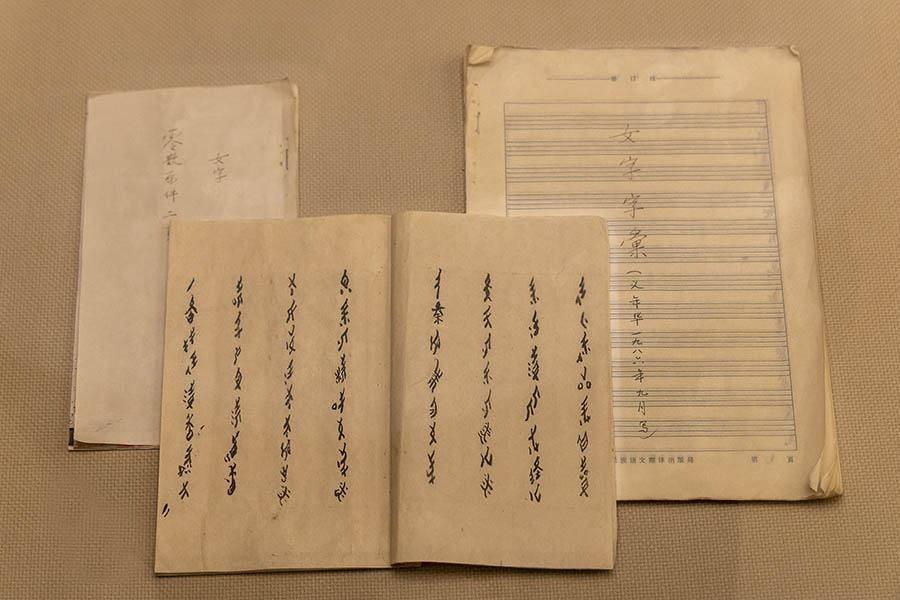 Copias originales dispersas de Nüshu, letras Nüshu y vocabulario Nüshu escrito a mano por Yi Nianhua, una de las últimas escritoras de Nüshu en 1988-89, se exhiben en el Museo Nacional de Mujeres y Ni?os de China en Beijing. Foto: VCG