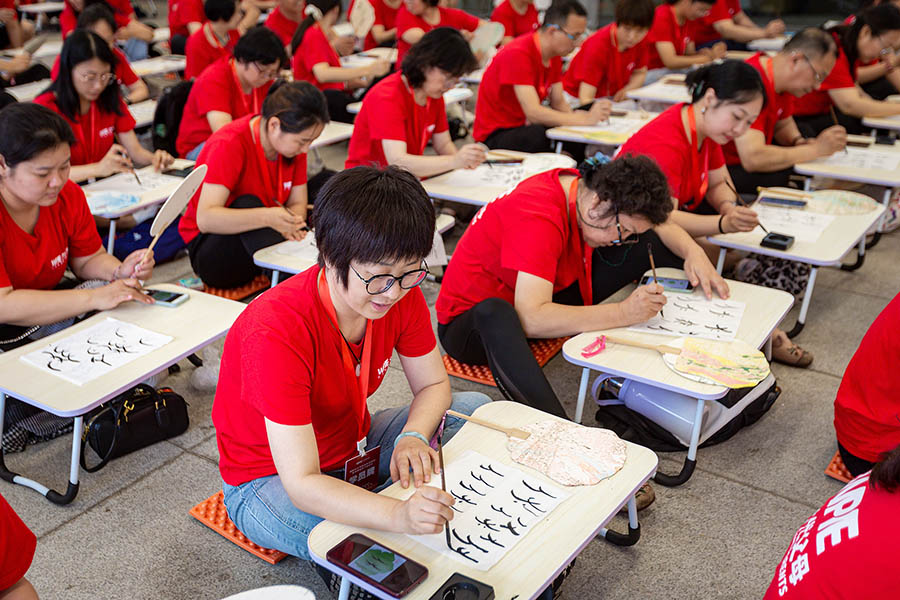 Al menos 350 expertos en educación familiar de toda China escriben Nüshu en abanicos de laca con pinceles chinos en el Museo Nacional de Escritura China en Anyang, provincia de Henan, en el centro de China, el 21 de junio de 2024. Foto: VCG