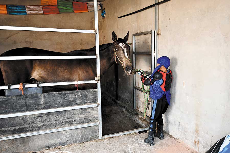 Aztai saca a su caballo del establo para el entrenamiento diario. [Foto/Xinhua]