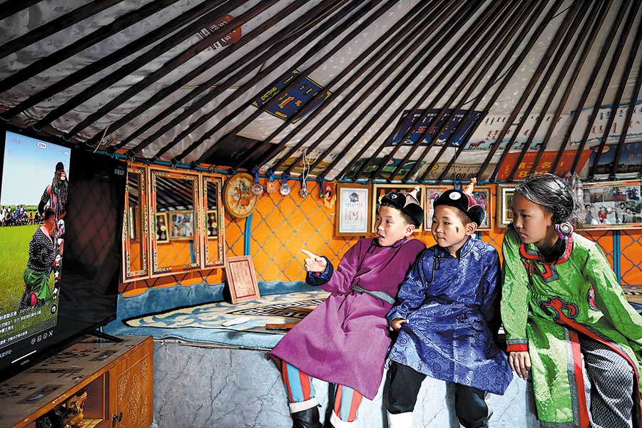 Chilmeg (izquierda) mira lucha libre por televisión en su casa. [Foto/Xinhua]